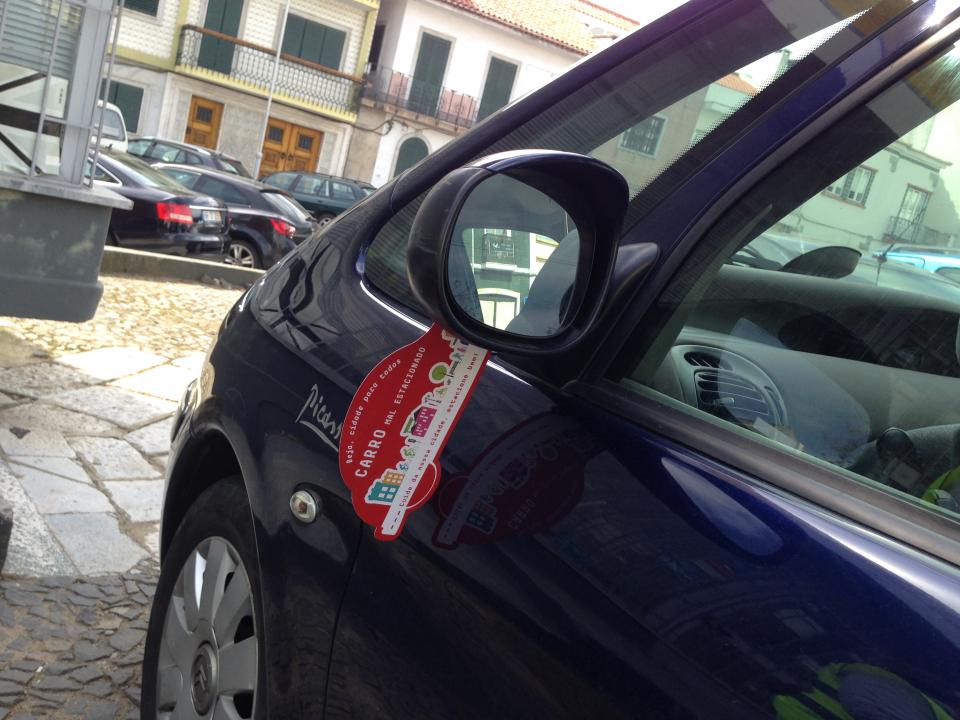- CARRO BEM ESTACIONADO: Os meninos deram os parabéns ao condutor pendurando, com um elástico, um carrinho de “BEM ESTACIONADO” no retrovisor com informação tópica sobre os objetivos desta campanha.